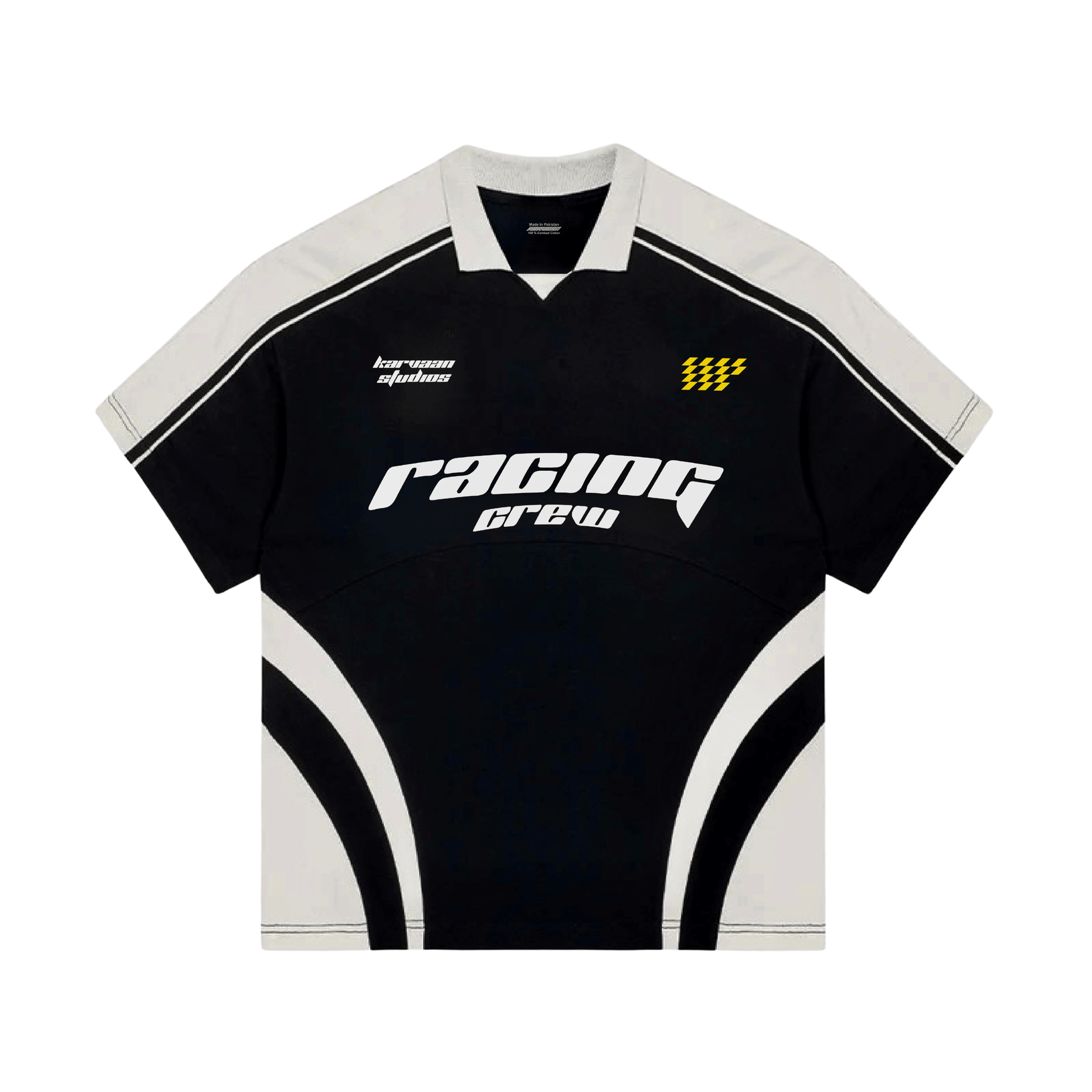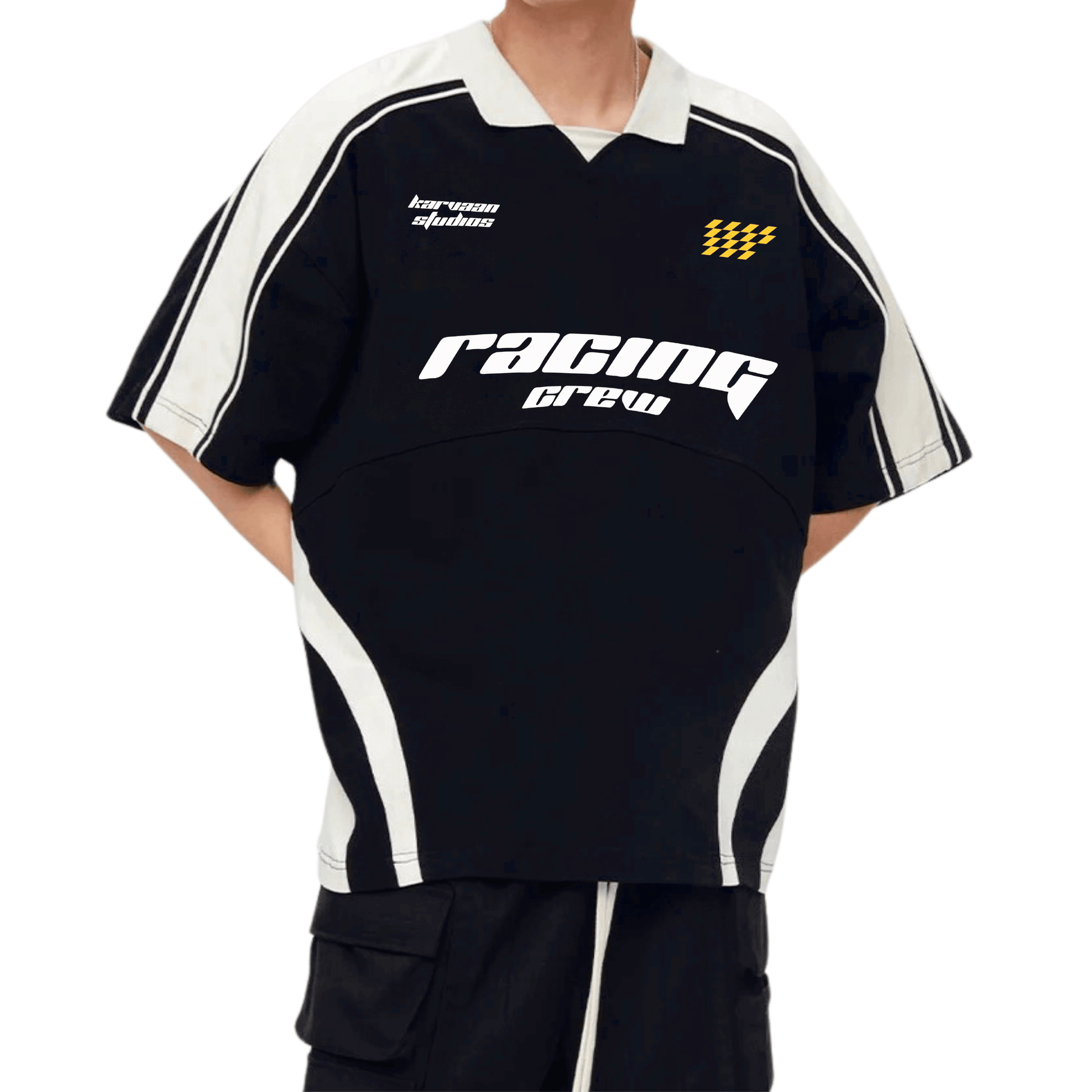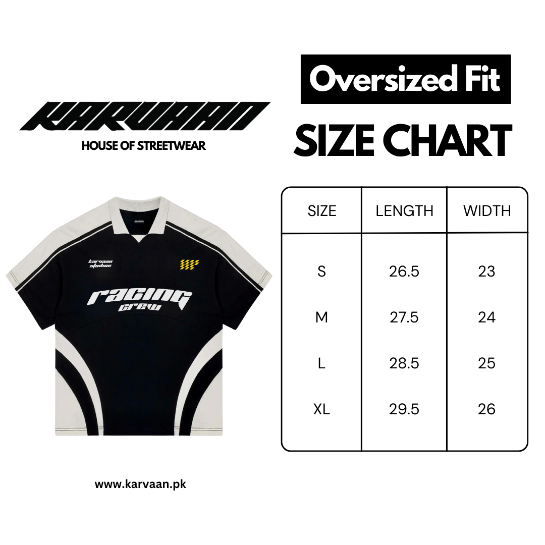 Sleek monochrome fusion meets adrenaline-fueled design in the KARVAAN RACER TEE. Crafted from luxe 220 GSM FABRIC, this streetwear masterpiece boasts bold contrast panels and dynamic racing-inspired graphics. The retro polo collar adds a touch of refinement to its rebellious spirit. A sartorial status symbol for the streetwear connoisseur who lives life at full throttle.